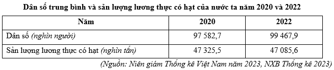 Căn cứ vào bảng số liệu trên, hãy cho biết sản lượng lương thực có hạt bình quân đầu người của nước ta năm 2022 ít hơn năm 2020 bao nhiêu kg/người (làm tròn kết quả đến một chữ số thập phân).