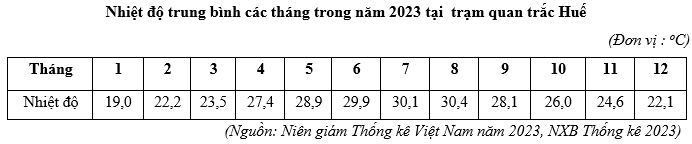 Căn cứ vào bảng số liệu trên, hãy cho biết biên độ nhiệt độ năm tại trạm quan trắc Huế năm 2023 là bao nhiêu oC (làm tròn kết quả đến một chữ số thập phân).