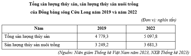 Căn cứ vào bảng số liệu trên, hãy cho biết tỉ trọng sản lượng thủy sản nuôi trồng trong tổng sản lượng thủy sản của vùng Đồng bằng sông Cửu Long năm 2022 so với năm 2019 tăng thêm bao nhiêu phần trăm (làm tròn kết quả đến một chữ số thập phân).