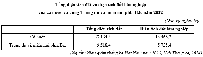 Căn cứ vào bảng số liệu trên, hãy cho biết tỉ trọng đất lâm nghiệp trong tổng diện tích đất của Trung du và miền núi phía Bắc cao hơn trung bình cả nước là bao nhiêu %? (làm tròn kết quả đến một chữ số thập phân)