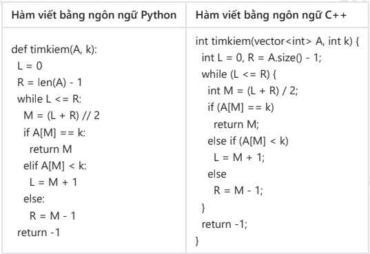 Thuật toán sau được viết bằng Python hoặc C++ để thực hiện thuật toán tìm kiếm: