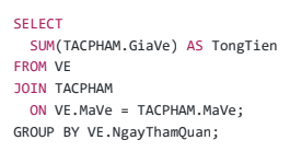 | a) Phần mềm quản trị cơ sở dữ liệu tính tổng số tiền bán hàng theo ngày dựa trên bảng VE . | ||