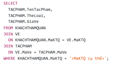 Cho cơ sở dữ liệu của một bảo tàng nghệ thuật với ba bảng có cấu trúc sau:KHACHTHAMQUAN