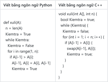 | b) Biến Kiemtra dùng để kết thúc vòng lặp while nếu trong quá trình thực hiện vòng lặp for mà không có hoán đổi 2 phần tử liền kề | ||