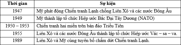 | c) Bảng thông tin trên phản ánh các sự kiện chính của cuộc Chiến tranh lạnh giữa Mỹ và Liên Xô sau Chiến tranh thế giới thứ hai. | ||