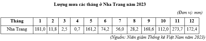 Căn cứ vào bảng số liệu trên, hãy cho biết tổng lượng mưa năm 2023 tại trạm quan trắc Nha Trang là bao nhiêu mm (làm tròn kết quả đến hàng đơn vị).