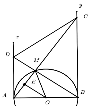 Cho nửa đường tròn $(O)$ đường kính $AB$, từ $A$ và $B$ vẽ hai tiếp tuyến $Ax;By$ và cùng phía với nửa đường tròn $(O)$. Điểm $M$ thuộc nửa đường tròn $(M$ khác $A,B)$; $AM$ cắt $By$ tại $C;BM$ cắt $Ax$ tại $D$. Gọi $E$ là trung điểm của đoạn $AM$.