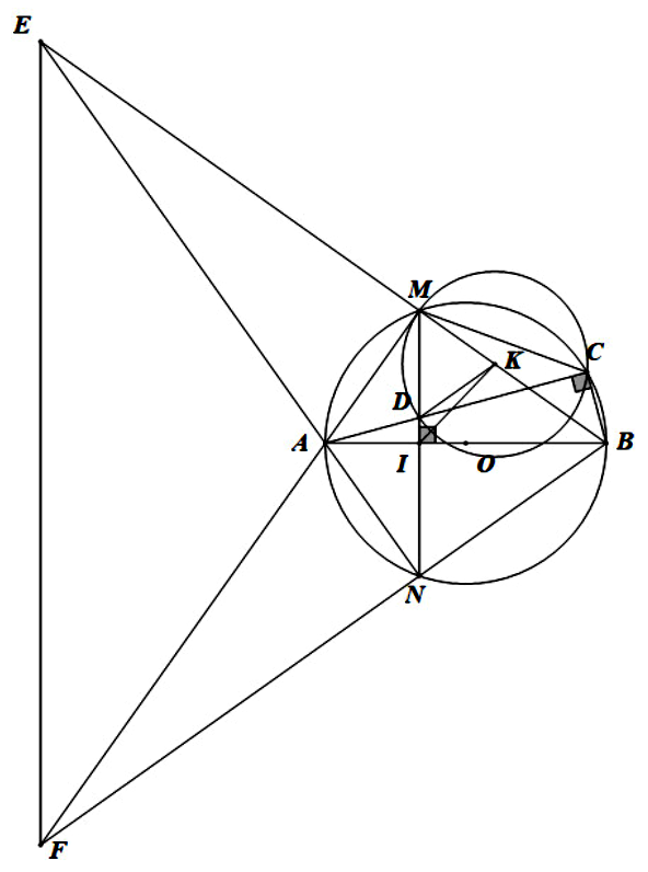 Cho đường tròn $\left( {O;R} \right)$ có đường kính $AB$ cố định, $I$ là điểm thuộc đoạn thẳng $AO$ sao cho $AI = 2IO$. Đường thẳng qua $I$ vuông góc với đường thẳng $AB$ cắt đường tròn $(O)$ tại hai điểm phân biệt $M$ và $N$. Điểm $C$ di động trên cung nhỏ $MB$ ($C$ không trùng với $M$ và $B),E$ là giao điểm của hai đường thẳng $AN$ và $BM$. Đường thẳng qua $E$ vuông góc với đường thẳng $AB$ cắt đường thẳng $AM$ tại $F$.