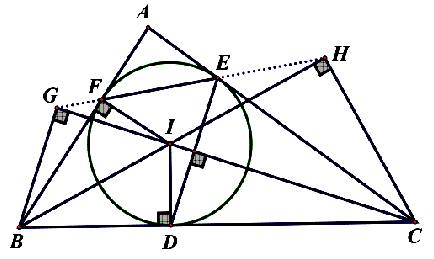 Cho tam giác $ABC(AB < AC < BC)$ ngoại tiếp đường tròn $(I)$ với các tiếp điểm trên $BC,CA,AB$ lần lượt là $D,E,F$. Gọi $G$ và $H$ lần lượt là chân đường vuông góc hạ từ $B$ và $C$ xuống $CI$ và $BI$. Chứng minh rằng: