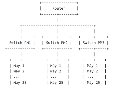 Một trường học có 03 phòng máy, mỗi phòng có 25 máy tính. Các máy trong mỗi phòng được kết nối qua một switch, và các switch của ba phòng được kết nối với nhau thông qua một router để truy cập Internet.