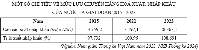 Căn cứ vào bảng số liệu trên, hãy cho biết trong giai đoạn 2015 – 2023, giá trị nhập khẩu của nước ta tăng bao nhiêu tỷ USD? (Làm tròn kết quả đến chữ số hàng đơn vị của tỷ USD).