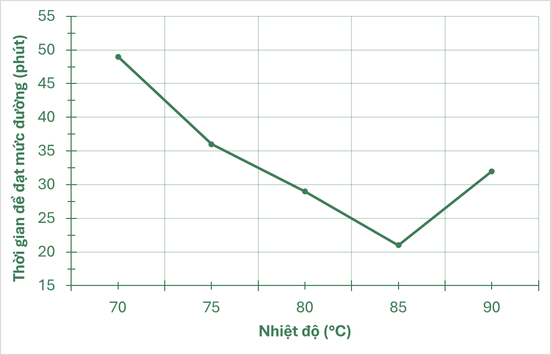 Trong một nghiên cứu nhằm tối ưu hóa quá trình thủy phân tinh bột gạo lứt huyết rồng bằng enzyme α-amylase, người nghiên cứu đã khảo sát ảnh hưởng của nhiệt độ đến hiệu quả hoạt động của enzyme. Quá trình enzyme phân giải tinh bột tạo ra các đường khử, một chỉ số dùng để đánh giá mức độ thủy phân. Hiệu quả của enzyme trong nghiên cứu này được đánh giá dựa trên thời gian cần thiết để đạt hàm lượng đường khử 10 g L–1 trong dung dịch sau thủy phân. Thí nghiệm được tiến hành ở năm mức nhiệt độ, được gán số thứ tự lần lượt như sau: (1) là 75 °C; (2) là 80 °C; (3) là 85 °C; (4) là 70 °C; (5) là 90 °C. Kết quả thí nghiệm được biểu diễn dưới dạng đồ thị như sau:
