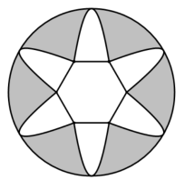 Để trang trí bức tường trong một căn phòng, bạn Hoa vẽ lên tường một hình như sau: Đầu tiên bạn vẽ một hình lục giác đều có cạnh bằng 2 dm; sau đó, trên mỗi cạnh của hình lục giác vẽ một cánh hoa hình parabol đi qua hai đầu mút của cạnh, đỉnh parabol nằm phía ngoài hình lục giác và cách cạnh tương ứng 3 dm; cuối cùng bạn vẽ một đường tròn đi qua tất cả các đỉnh của sáu parabol ở trên (xem hình vẽ).