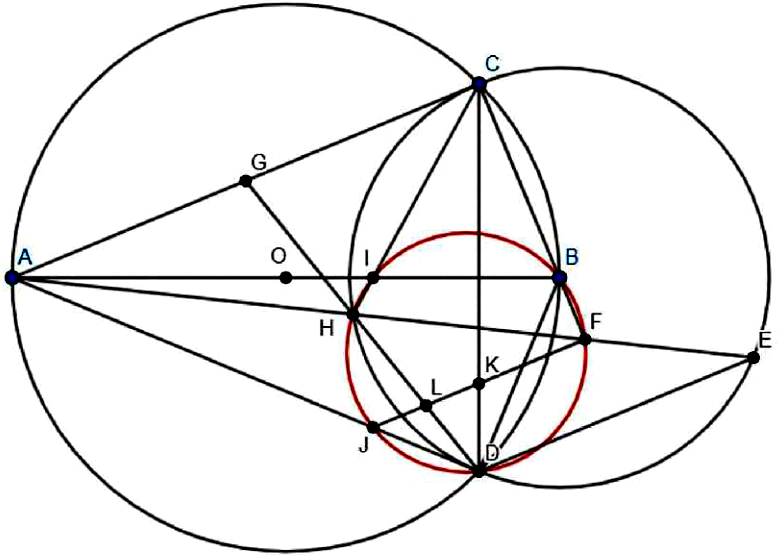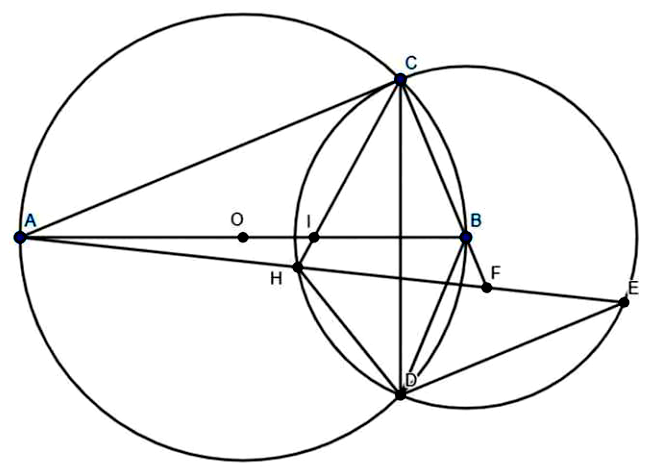 Trên đường tròn đường kính $AB$, lấy các điểm $C$ và $D$ sao cho $BC = BD < \dfrac{1}{2}AB$. Gọi $E$ là điểm đối xứng với $D$ qua đường thẳng $BC,AE$ cắt tia $CB$ tại $F$, cắt đường tròn $\left( {B,BC} \right)$ tạo $H\left( {H \neq E} \right),CH$ cắt $AB$ tại $I$.