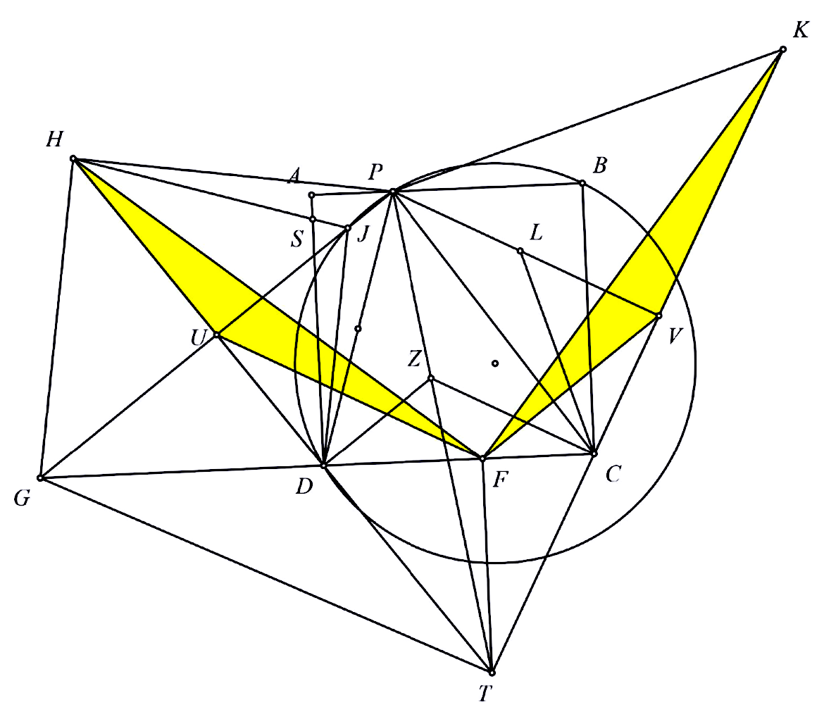 c) $PJ$ cắt $HD$ tại $U,PL$ cắt $CK$ tại $V$. PU cắt $DC$ tại G. HD cắt $KC$ tại $T$.