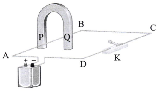 Một học sinh bố trí một thí nghiệm như hình bên. Khi đóng khóa K, bạn học sinh nhận thấy phần dây dẫn AB , nằm giữa hai cực P và Q của nam châm móng ngựa, bị kéo xuống phía dưới. Kết luận nào sau đây đúng?