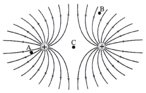 Đường sức điện trường của hệ hai điện tích dương được thể hiện như hình bên. Gọi $E_{A},\,\, E_{B}$ và $E_{C}$ lần lượt là độ lớn của cường độ điện trường tại ba điểm $\text{A},\text{B}$ và C. Kết luận nào dưới đây đúng?