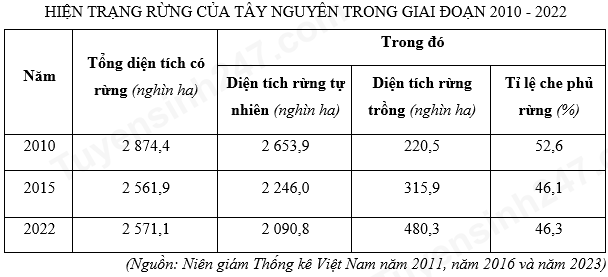 Dựa vào bảng số liệu, hãy chọn nhận xét đúng về diện tích và tỉ lệ che phủ rừng của Tây Nguyên trong giai đoạn 2010 - 2022.