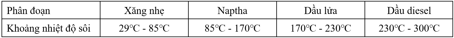 Sản phẩm thu được sau quá trình tiền xử lí dầu thô được đem chưng cất phân đoạn thì thu được xăng nhẹ, dầu diesel, dầu lửa, naphtha. Khoảng nhiệt độ sôi của các phân đoạn trong quá trình chưng cất dầu mỏ ở áp suất thường của một nhà máy được cho trong bảng sau: