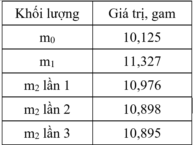 Giá trị m2 lần 3 được sử dụng để tính toán. Kết quả thí nghiệm được ghi trong bảng bên.