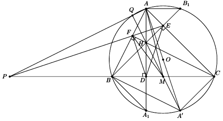 Cho tam giác nhọn $ABC$ với $AB < AC$. Ba đường cao $AD,BE,CF$ cắt nhau tại $H$ (với $D \in BC,E \in AC,F \in AB$). Gọi $A_{1},B_{1}$ lần lượt là các điểm đối xứng với $H$ qua $D$ và $E;M$ là trung điểm của $BC$. Hai đường thẳng $EF$ và $BC$ cắt nhau tại điểm $P$.