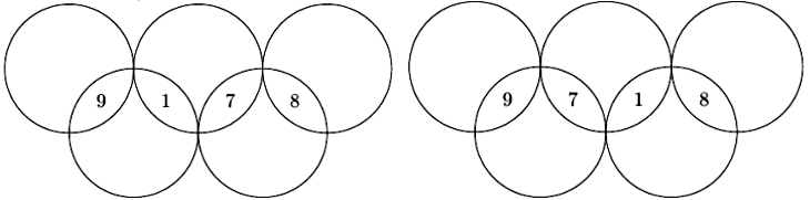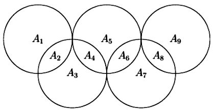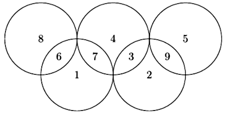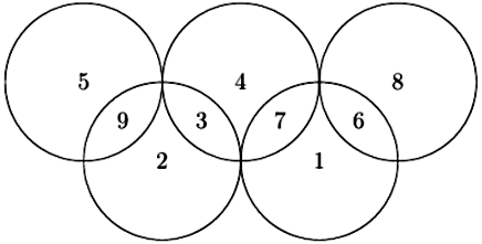 b) Cho 5 đường tròn có cùng bán kính và sắp xếp để tạo thành 9 miền được kí hiệu là $A_{1},A_{2},\ldots,A_{9}$ (như hình vẽ). Sau đó, điền vào 9 miền trên các số được lấy từ $1,2,3,4,5,6,7,8,9$ sao cho mỗi miền được điền bởi một số, hai miền khác nhau được điền bởi hai số khác nhau và tổng các số trong mỗi hình tròn đều bằng 14.