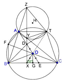 Cho tam giác nhọn $ABC$ có $AB < AC$. Gọi $(O)$ là đường tròn ngoại tiếp tam giác $ABC$. Đường thẳng $AO$ cắt $BC$ tại $E$. Trên đoạn $AO$ lấy điểm $D$ sao cho $OD = OE$. Đường đi thẳng qua $D$, vuông góc với $BC$ cắt $BC,AC,AB$ lần lượt tại $X,Y,Z$. Đường tròn ngoại tiếp tam giác $AYZ$ cắt lại $(O)$ tại điểm $T$ khác $A$. Chứng minh rằng: