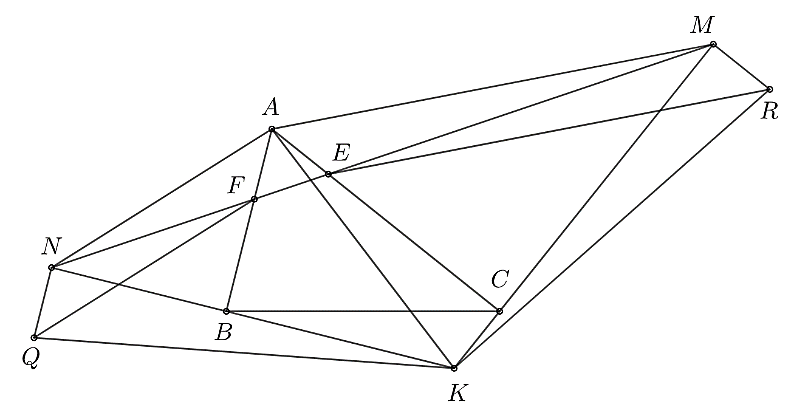 2) Dựng các hình bình hành $ANQF$ và $AMRE$. Chứng minh rằng $\angle NQK = \angle MRK$