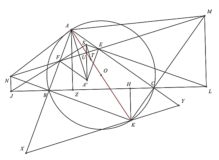 3) Gọi $L,\,\, J$ lần lượt là hình chiếu vuông góc của các điểm $M,\,\, N$ trên đường thẳng $BC$; $S$ là giao điểm của hai đường thẳng $JF$ và $LE;\,\, T$ là điểm đối xứng với điểm $S$ qua đường thẳng $EF$. Chứng minh rằng ba điểm $A,\,\, T,\,\, K$ thẳng hàng