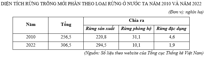 Căn cứ vào bảng số liệu, nhận xét nào sau đây đúng về tình hình trồng rừng mới phân theo loại rừng ở nước ta năm 2022 và năm 2010?