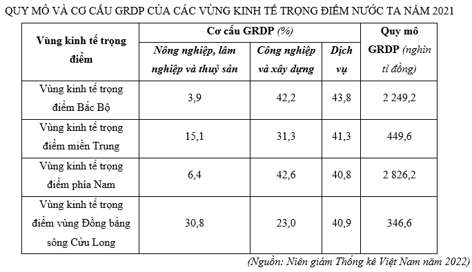 Cho bảng số liệu: Dựa vào bảng số liệu, hãy cho biết năm 2021, vùng kinh tế