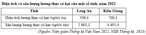Cho biết năng suất lương thực có hạt năm 2022 của tỉnh Long An thấp hơn tỉnh Kiên Giang bao nhiêu tạ/ha? (làm tròn kết quả đến một chữ số thập phân)