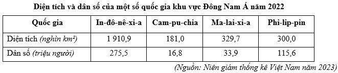 | d) Biểu đồ đường là dạng biểu đồ thích hợp nhất thể hiện diện tích và dân số của một số quốc gia khu vực Đông Nam Á năm 2022. |