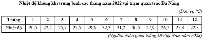 Căn cứ vào bảng số liệu trên, hãy cho biết biên độ nhiệt độ không khí trung bình năm 2022 tại trạm quan trắc Đà Nẵng là bao nhiêu °C (làm tròn kết quả đến một chữ số thập phân).