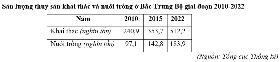 Căn cứ vào bảng số liệu, hãy cho biết tốc độ tăng trưởng sản lượng thuỷ sản ở Bắc Trung Bộ năm 2022 so với năm 2010 tăng bao nhiêu %? (làm tròn kết quả đến hàng đơn vị).