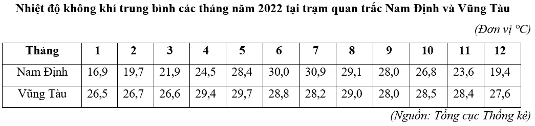 Căn cứ vào bảng số liệu, hãy cho biết biên độ nhiệt trung bình năm, năm 2022 tại Vũng Tàu thấp hơn Nam Định bao nhiêu °C? (làm tròn kết quả đến một chữ số thập phân).