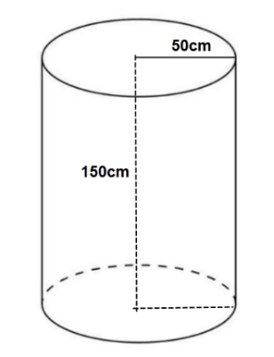 Gia đình bạn Khánh đang sử dụng một thùng đựng nước dạng hình trụ với bán kính đáy bằng 50 cm và chiều cao bằng 150 cm. Thùng đựng nước được đặt thẳng đứng trên mặt sàn như hình minh họa bên. (Lấy π ≈ 3,14 và coi chiều dày của thùng không đáng kể).