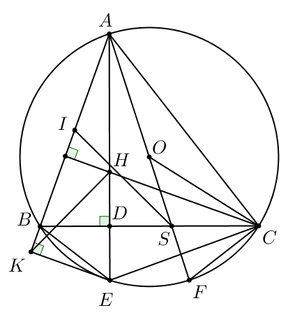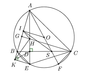 Cho tam giác $ABC$ có ba góc nhọn $\left( {AB < AC} \right)$, nội tiếp đường tròn $(O)$. Đường cao $AD$ của tam giác $ABC$ cắt đường tròn $(O)$ tại điểm $E$ ($E$ khác $A$). Gọi $K$ là chân đường vuông góc kẻ từ điểm $E$ đến đường thẳng $AB$