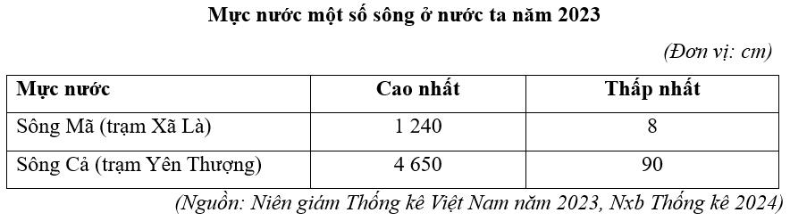 Căn cứ vào bảng số liệu trên, hãy cho biết năm 2023 sự chênh lệch mực nước cao nhất và mực nước thấp nhất của sông Cả tại trạm Yên Thượng cao hơn so với sự chênh lệch mực nước cao nhất và mực nước thấp nhất của sông Mã tại trạm Xã Là là bao nhiêu cm.