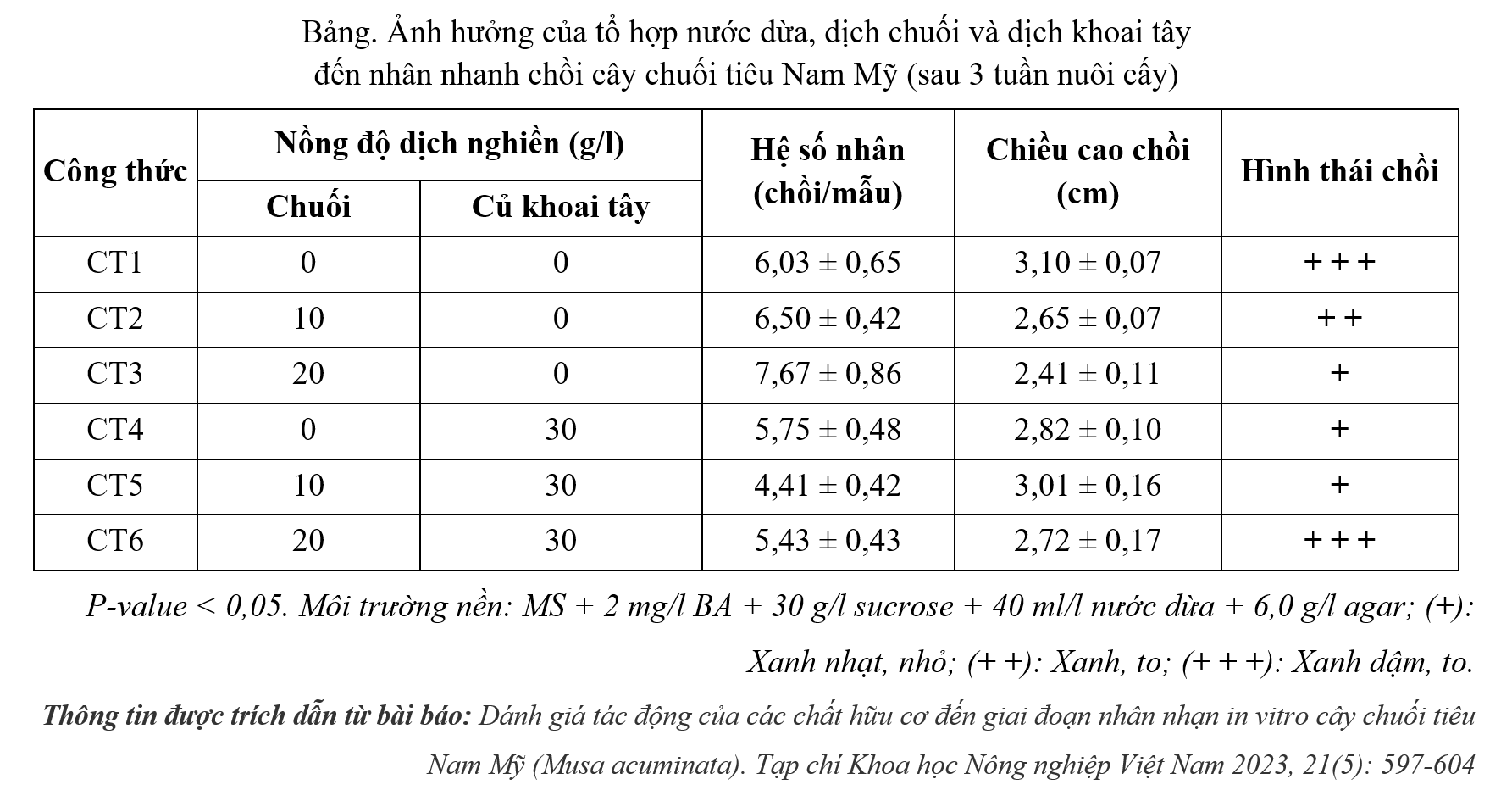 Một nghiên cứu được tiến hành nhằm xác định ảnh hưởng của một số dịch hữu cơ (nước dừa, chuối, khoai tây) ở các nồng độ và phương thức bổ sung khác nhau đến sự nhân nhanh in vitro chồi chuối tiêu Nam Mỹ. Các dịch hữu cơ được bổ sung vào môi trường nhân nhanh MS + 2 mg/l Benzyladenine + 30 g/l đường + 6,0 g/l agar. Các chỉ tiêu theo dõi bao gồm hệ số nhân chồi, chiều cao chồi và hình thái chồi in vitro chuối tiêu Nam Mỹ. Kết quả cho thấy, các loại dịch hữu cơ này đều có tác động tích cực đến sự nhân nhanh chồi in vitro chuối tiêu Nam Mỹ. Nồng độ nước dừa 40 ml/l hoặc chuối 20 g/l hoặc khoai tây 30 g/l được bổ sung vào môi trường nuôi cấy đều làm tăng hệ số nhân chồi và sai khác có ý nghĩa thống kê với công thức đối chứng (không bổ sung dịch hữu cơ). Hệ số nhân đạt cao nhất khi tổ hợp 40 ml/l nước dừa + 20 g/l chuối được bổ sung vào môi trường nuôi cấy (Bảng 1).