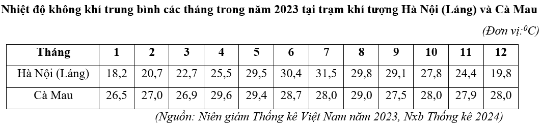 Căn cứ vào bảng số liệu trên, hãy cho biết biên độ nhiệt độ năm của Hà Nội cao hơn biên độ nhiệt độ năm của Cà Mau là bao nhiêu 0C (làm tròn kết quả đến một chữ số thập phân).