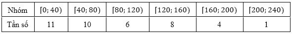 Một người chia thời lượng (đơn vị: giây) thực hiện các cuộc gọi điện thoại của mình trong một tuần thành sáu nhóm và lập bảng tần số ghép nhóm như sau.