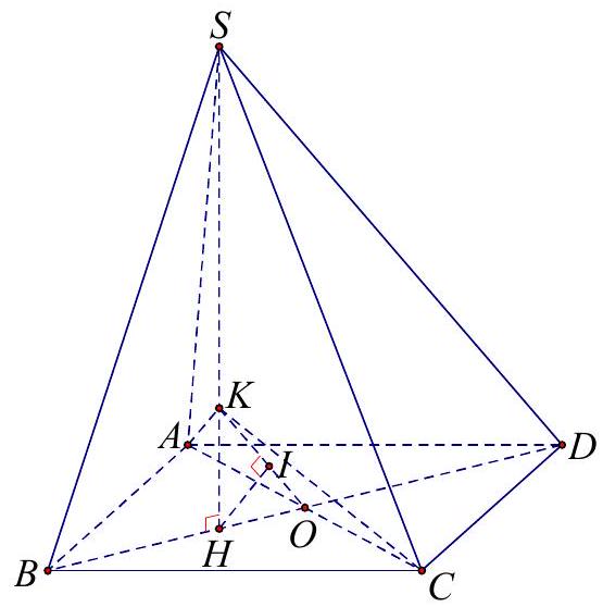 Gọi $O$ là tâm hình thoi $ABCD,K$ nằm trên đoạn $SH$ sao cho $HK = \dfrac{1}{4}SH = \dfrac{\sqrt{3}}{4}$.