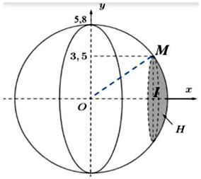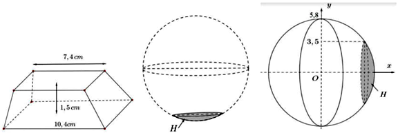 Để đặt được một vật trang trí trên mặt bàn, người ta thiết kế một chân đế như sau: lấy một khối gỗ có dạng khối chóp cụt tứ giác đều với độ dài hai cạnh đáy lần lượt bằng $7,4cm$ và $10,4cm$, bề dày của khối gỗ bằng $1,5cm$. Sau đó khoét bỏ đi một phần của khối gỗ sao cho phần đó có dạng vật thể $H$, ở đó $H$ nhận được bằng cách cắt khối cầu bán kính $5,8cm$ bởi một mặt phẳng cắt mà mặt cắt là hình tròn bán kính $3,5cm$ (xem hình dưới).