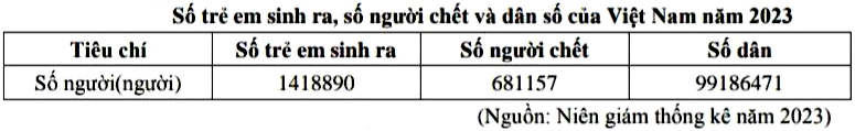 Căn cứ vào bảng số liệu trên, tính tỉ suất gia tăng dân số tự nhiên của Việt Nam năm 2023 (làm tròn kết quả đến hai chữ số thập phân của ‰)