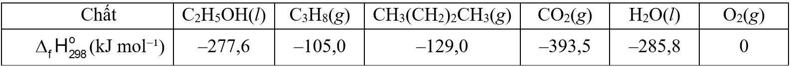 Lượng nhiệt tỏa ra khi đốt cháy hoàn toàn 1 gam nhiên liệu (kí hiệu là Q, tính theo kJ g⁻¹) được sử dụng để đánh giá mức độ “giàu năng lượng” của nhiên liệu đó. Ở điều kiện chuẩn, giá trị Q của ethanol lỏng và một loại khí đốt G lần lượt là QE và QG. Cho biết: G chỉ chứa propane và butane với tỉ lệ mol tương ứng là 1: 2; nhiệt tạo thành chuẩn ($\Delta_{f}^{}H_{298}^{o}$) của các chất được cho trong bảng: