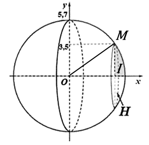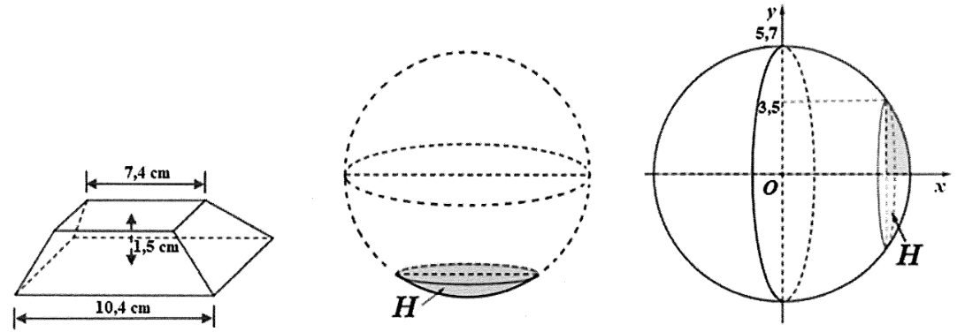 Để đặt được một vật trang trí trên mặt bàn, người ta thiết kế một chân đế như sau. Lấy một khối gỗ có dạng khối chóp cụt tứ giác đều với độ dài hai cạnh đáy lần lượt bằng 7,4 cm và 10,4 cm, bề dày khối gỗ bằng 1,5 cm. Sau đó khoét bỏ đi một phần của khối gỗ sao cho phần đó có dạng vật thể $H$, ở đó $H$ nhận được bằng cách cắt khối cầu bán kính $5,7$ cm bởi một mặt phẳng cắt mà mặt cắt là hình tròn bán kính 3,5 cm (xem hình dưới)