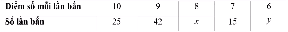 Điểm số trung bình của một vận động viên bắn súng sau 100 lần bắn là 8,69 điểm. Kết quả cụ thể được ghi trong bảng dưới đây, trong đó có hai ô bị mờ không đọc được (đánh dấu $x,y$). Tìm $x$ và $y$.