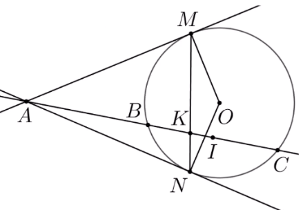 Cho đường tròn $(O)$ cố định. Từ một điểm $A$ cố định ở bên ngoài đường tròn $(O)$, dựng các tiếp tuyến $AM$ và $AN$ với đường tròn ($M,N$ là các tiếp điểm). Đường thẳng đi qua $A$ cắt đường tròn $(O)$ tại hai điểm $B$ và $C$ ($B$ nằm giữa $A$ và $C$). Gọi $I$ là trung điểm của $BC$)