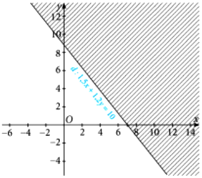 | c) Miền nghiệm của bất phương trình \(1,5 x+1,2 y \leq 10\) là nửa mặt phẳng bờ là đường thẳng \(d: 1,5 x+1,2 y=10\) chứa điểm \(O(0 ; 0)\) | ||